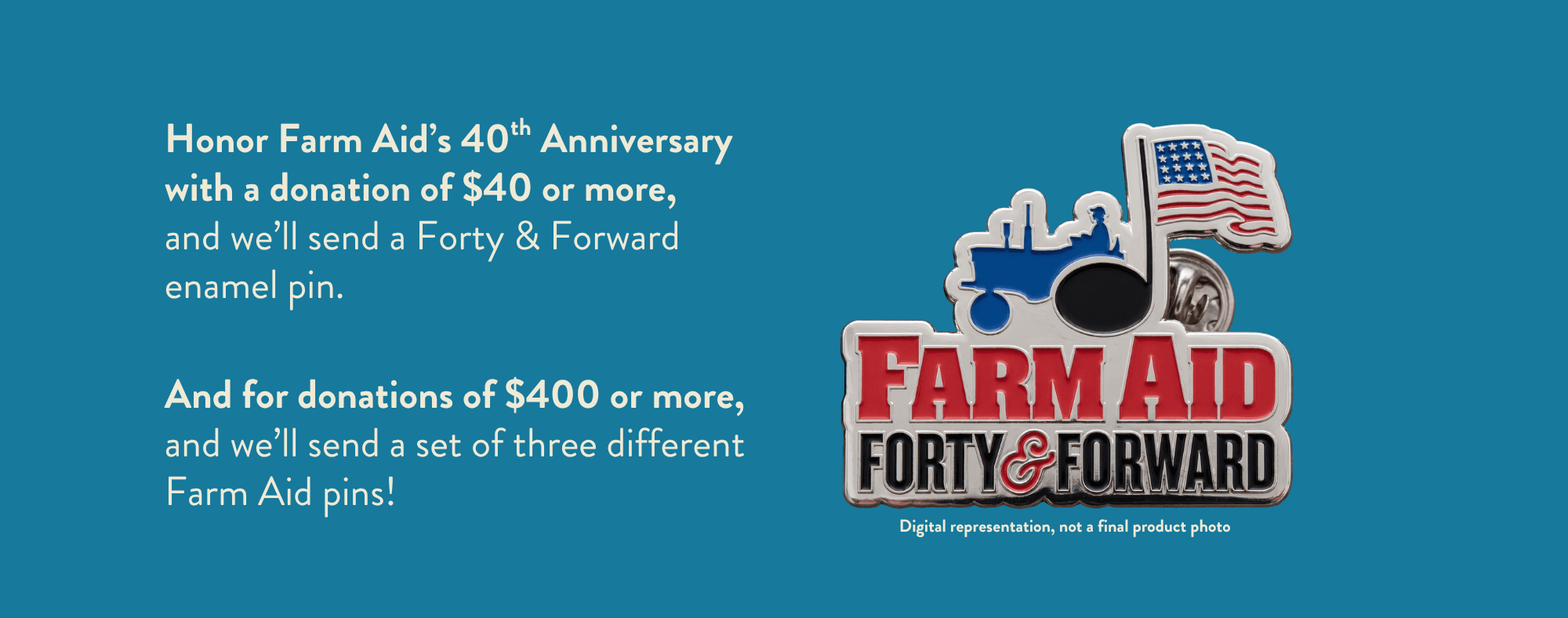 As a small symbol of our appreciation to those who generously donate $40 or more, we’ll send a special 40th Anniversary enamel pin with our Farm Aid Forty & Forward campaign logo so you can proudly show your support for family farmers. And for donations of $400 or more, we'll send you a set of three different Farm Aid pins!